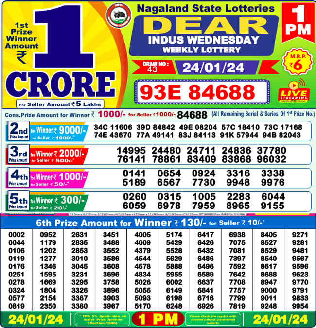 nagaland-1pm-result-24-1-2024 Previous Results Golden Fast Lotto Lottery Result 9:30 PM (Mon, Tue, Sun) Golden Keno Lottery Result 8 PM Today Winners 15.12.2025 Bhagyathara BT 33 Lottery Result Today Winners Mizoram Golden Star Lottery Result Today (6pm 8pm 9 PM) 14.12.2025 Samrudhi SM 33 Lottery Result Today Winners Golden Saturday Lotto Lottery Result 13.12.2025 (9.30 PM) Golden Jaldi 5 Lottery Result 9:30 PM (Wednesday, Friday) Kerala Lottery Result 13.12.2025 Karunya KR 734 Kerala Lottery Result 12.12.2025 Suvarna Keralam (SK 31) Kerala Lottery Result 12.12.2025 Karunya Plus KN 601 Winners Other Related Results Golden Fast Lotto Lottery Result 9:30 PM (Mon, Tue, Sun) Golden Keno Lottery Result 8 PM Today Winners 15.12.2025 Bhagyathara BT 33 Lottery Result Today Winners Mizoram Golden Star Lottery Result Today (6pm 8pm 9 PM)